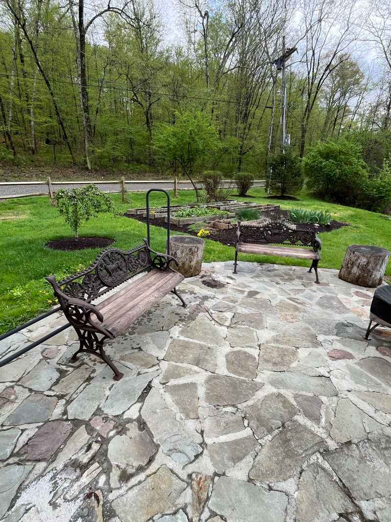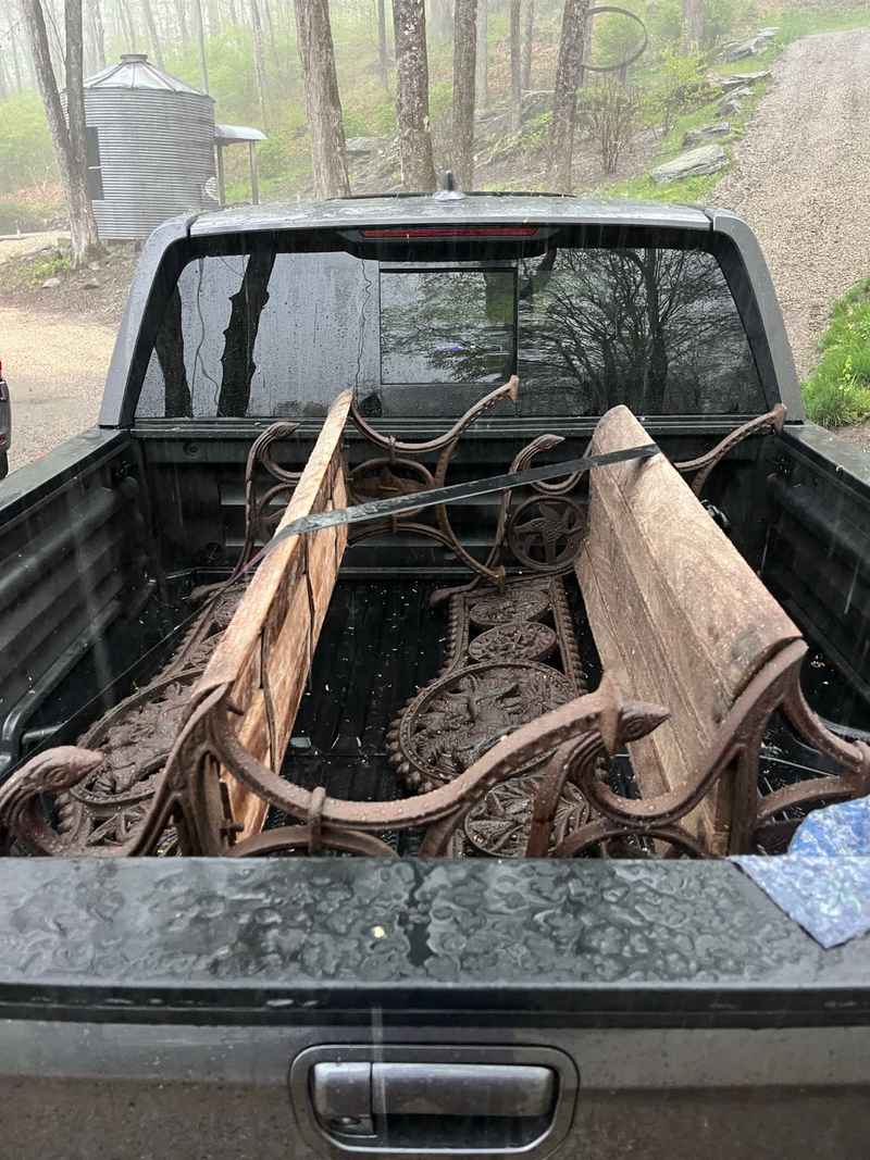 Image 1: Two antique benches loaded in the back of a Lugg Pickup at The Ticking Tent event. Image 2: Antique benches placed in (room of choice) a customer’s backyard after same-day delivery.