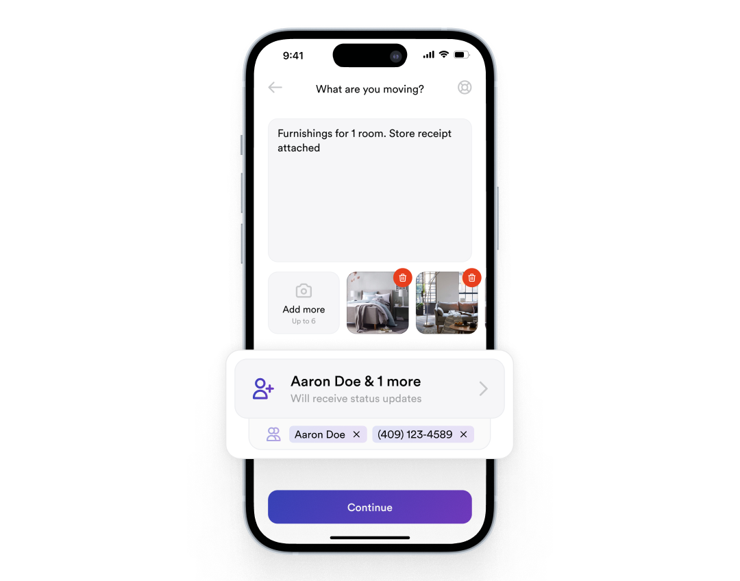 - Track your delivery: Watch your Luggers in real-time as they pick up and deliver your new furniture or appliances. You can even coordinate with the seller using built-in communication tools like adding Additional Contacts.